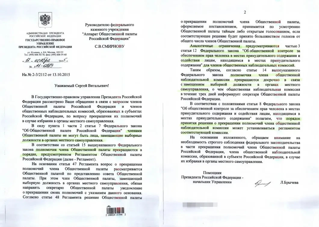 Еще ОП отказала восьми муниципальным депутатам в праве быть членами ОНК. «Позиция Общественной палаты, — заявил глава аппарата ОП Ярослав Семенов, — заключается в том, что депутаты местных органов самоуправления не могут быть членами ОНК. Общественная палата направляла запросы в соответствующие структуры для того, чтобы разъяснить…» Как выяснилось, еще год назад, в 2015 году, ОП отправила запрос руководителю Государственно-правового управления Ларисе Брычевой в администрацию президента. Брычева ответила, что членами ОНК не могут быть лица, замещающие выборные должности. То есть если депутаты, например, становятся председателями муниципальных собраний и получают за это деньги, то членами ОНК они быть не могут. А про не замещающих выборные должности в ответе Брычевой нет ни слова. Тем не менее ОП расценила ответ руководителя Государственно-правового управления как подтверждение того, что депутаты муниципальных собраний не могут быть членами ОНК.