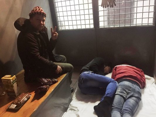 В полицейском участке мне не позволили общаться с Виталием Серукановым по поводу событий прошедшего дня, и я был помещен в изолятор (вероятно, речь о камере для административно задержанных — ОВД-Инфо), где находились уже знакомые мне люди, которые помогали фиксировать на видео мое утреннее задержание. Никаких протоколов я не подписывал и не читал. При изъятии вещей присутствовали неизвестные понятые, которые со слов Романа Михайловича (полицейского), являются «хорошо ему знакомыми, постоянными „палочками-выручалочками“ из местного спортивного клуба». Сохранность вещей не была должным образом обеспечена, т. к. ящики с вещами не запирались. Условия пребывания в камере были невыносимые, люди спали на полу, в туалет выпускали редко, я спал на деревянном настиле.