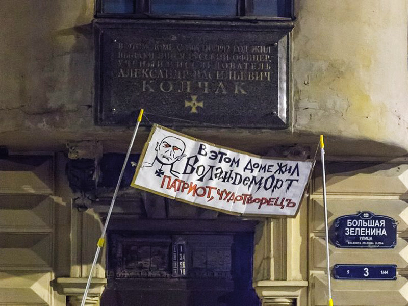 Мемориальную доску адмиралу Колчаку в Петербурге завесили плакатом с надписью про Волан-де-Морта