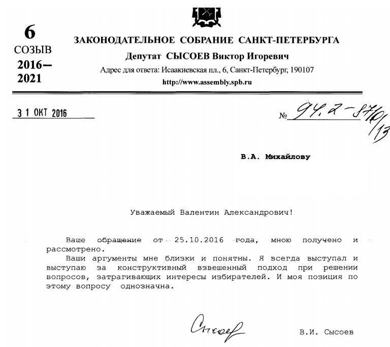 Депутат петербургского Закса Виктор Сысоев написал одинаковые ответы по двум разным запросам активистов. Об этом сообщил в соцсетях координатор движения «Гражданин Пушкин» Александр Беляев.