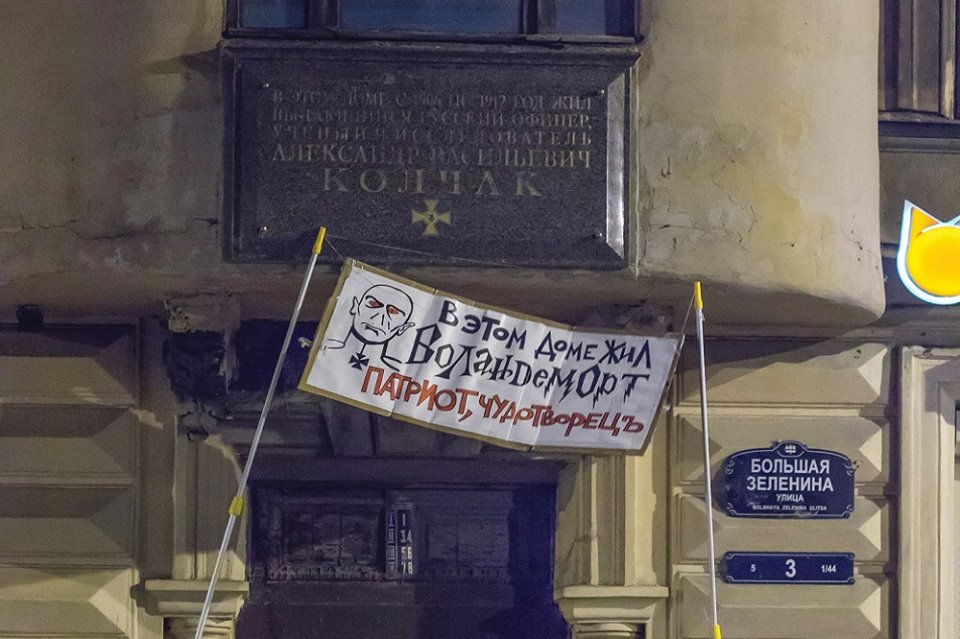 В Петербурге в ночь на 23 ноября рядом с памятной доской адмиралу Александру Колчаку активисты разместили плакат с изображением злодея Волан-де-Морта из книг о Гарри Поттере. Как сообщили в Российском социалистическом движении, плакат с надписью: "В этом доме жил Волан-де-Морт, патриот, чудотворец" установлен участниками арт-группы "Бѣлые ходоки".