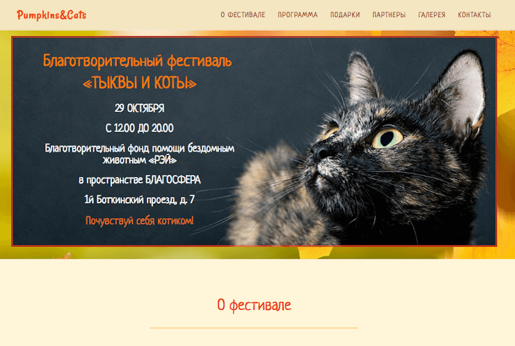 – Принимая во внимание, что в работе я очень ценю комфортность общения, считаю, что пока мне везет. Задачи, которые мы решили и закрыли, были поставлены людьми, с которыми мне было комфортно работать. Сайт фестиваля «ТЫКВЫ И КОТЫ» получился вполне информативным, аккуратным, а Екатерина Панова и Ирина Ганжа, которые представляли организатора фестиваля – Благотворительный фонд помощи бездомным животным «РЭЙ», четко сформулировали задачу, грамотно объяснили, что бы они хотели видеть на сайте. Это очень важно: заказчик понятно объяснил, что ему необходимо, исполнитель предложил техническое решение.