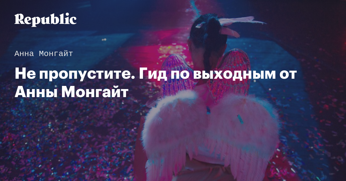 Каждую неделю Анна Монгайт отбирает для читателей Republic самые громкие и важные культурные события уикенда. Куда пойти, что посмотреть, как с умом провести свободное время в Москве и Санкт-Петербурге в режиме Weekly. Не пропустите.