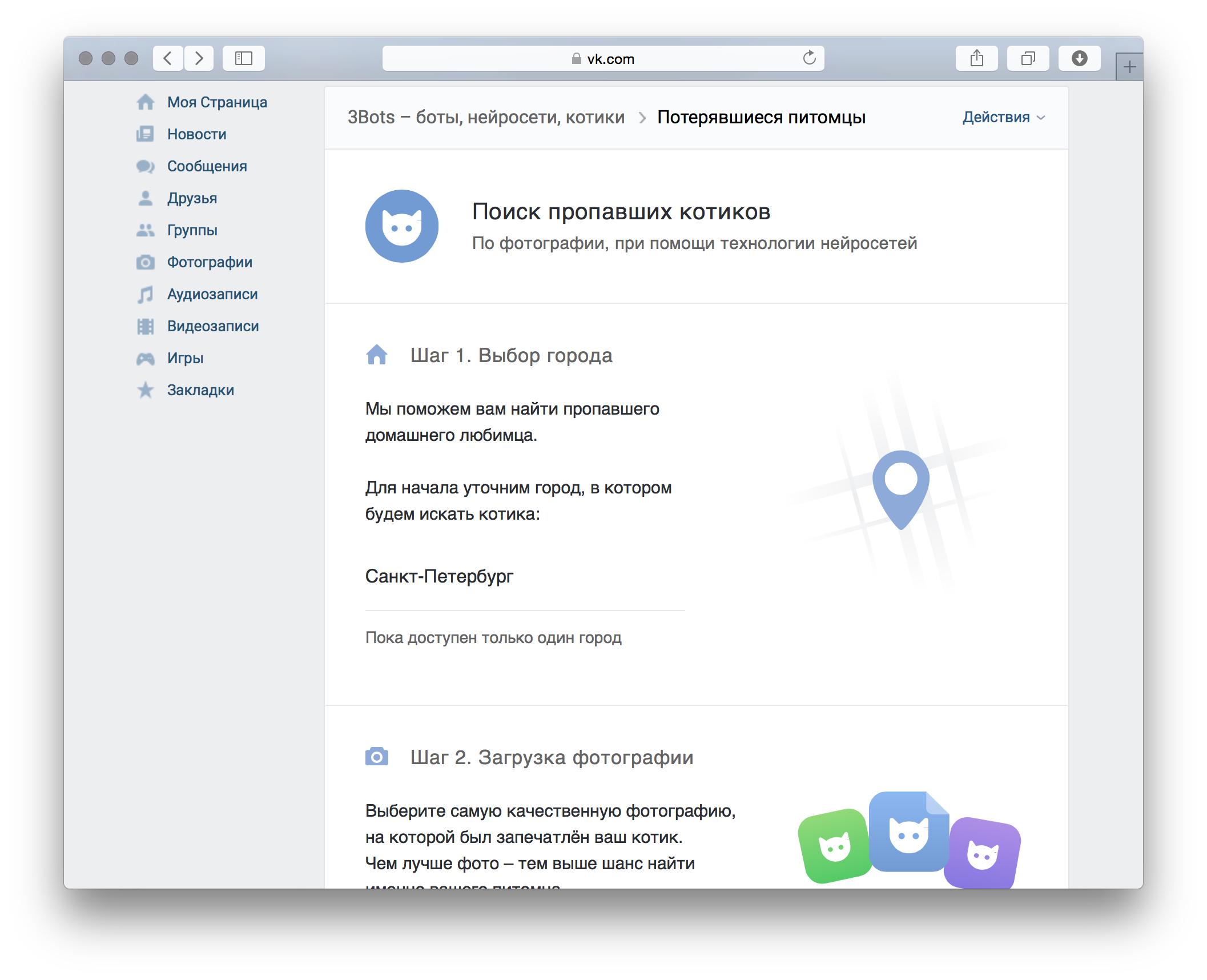 Команда 3bots разработала для социальной сети «ВКонтакте» приложение, которое ищет потерявшихся кошек и собак по фотографиям с помощью нейросетей.