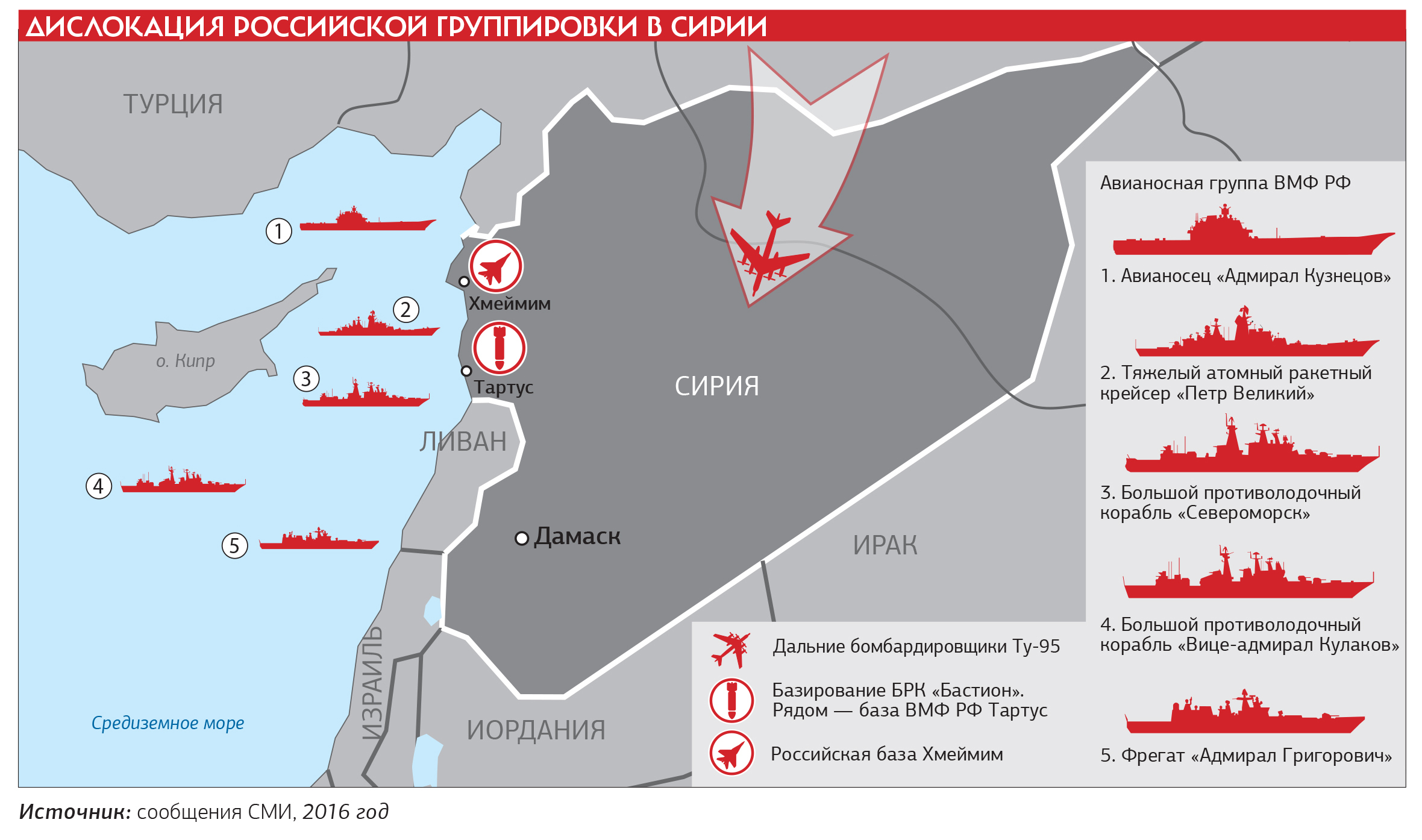 Если вы уверены, что все идет по плану, значит, у вас просто нет полной информации. Эта армейская мудрость вполне применима к ситуации вокруг Сирии: информация, которую рядовые российские граждане получают об операции российской группировки, почти целиком сводится к бравурным телерепортажам: истребители, грозно взлетающие с палубы тяжелого авианесущего крейсера «Адмирал Кузнецов», и стратегические бомбардировщики, прилетающие в Сирию откуда-то из центра России… Минобороны со ссылкой на разведданные сообщает: каждый «точечный» удар, нанесенный с моря и с воздуха, уничтожает чуть ли не по сотне террористов за раз.