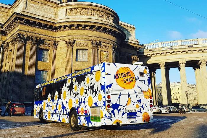 На Казанской площади в Петербурге презентовали «автобус счастья», разрисованный ромашками.