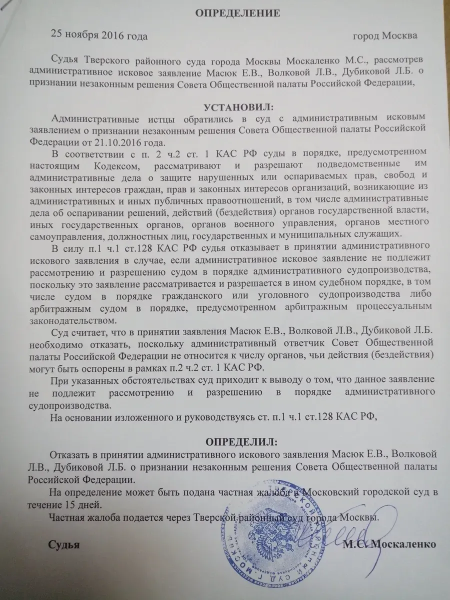 25 ноября судья Тверского суда Москвы Мария Москаленко отказала нам в принятии иска, сославшись на то, что наши исковые требования не подлежит рассмотрению в административном судопроизводстве, «поскольку это заявление рассматривается и разрешается в ином судебном порядке, в том числе судом в порядке гражданского или уголовного судопроизводства либо арбитражным судом». Ну а кроме того судья Москаленко решила, что «административный ответчик Совет Общественной палаты РФ не относится к числу органов, чьи действия могут быть оспорены в рамках п. 2 ч. 2 ст. 1 КАС РФ».