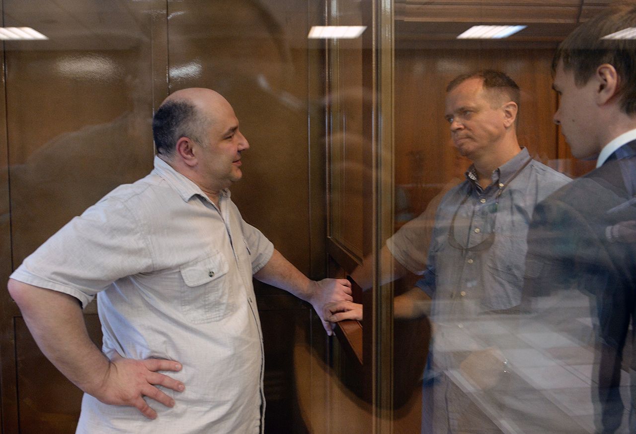 Фото: Геннадий Гуляев / «Коммерсантъ» Бывший сотрудник ГРУ Геннадий Кравцов (слева) со своими защитниками — Иваном Павловым и Евгением Смирновым (крайний справа) в зале заседаний Московского городского суда, 21 сентября 2015 года