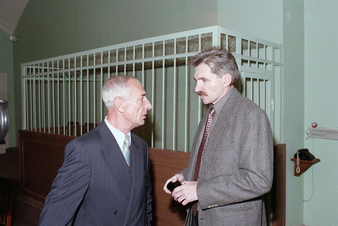 Фото: Сергей Смольский / ТАСС Адвокат Юрий Шмидт (слева) и его клиент капитан Александр Никитин перед заседанием суда, 20 октября 1998 года
