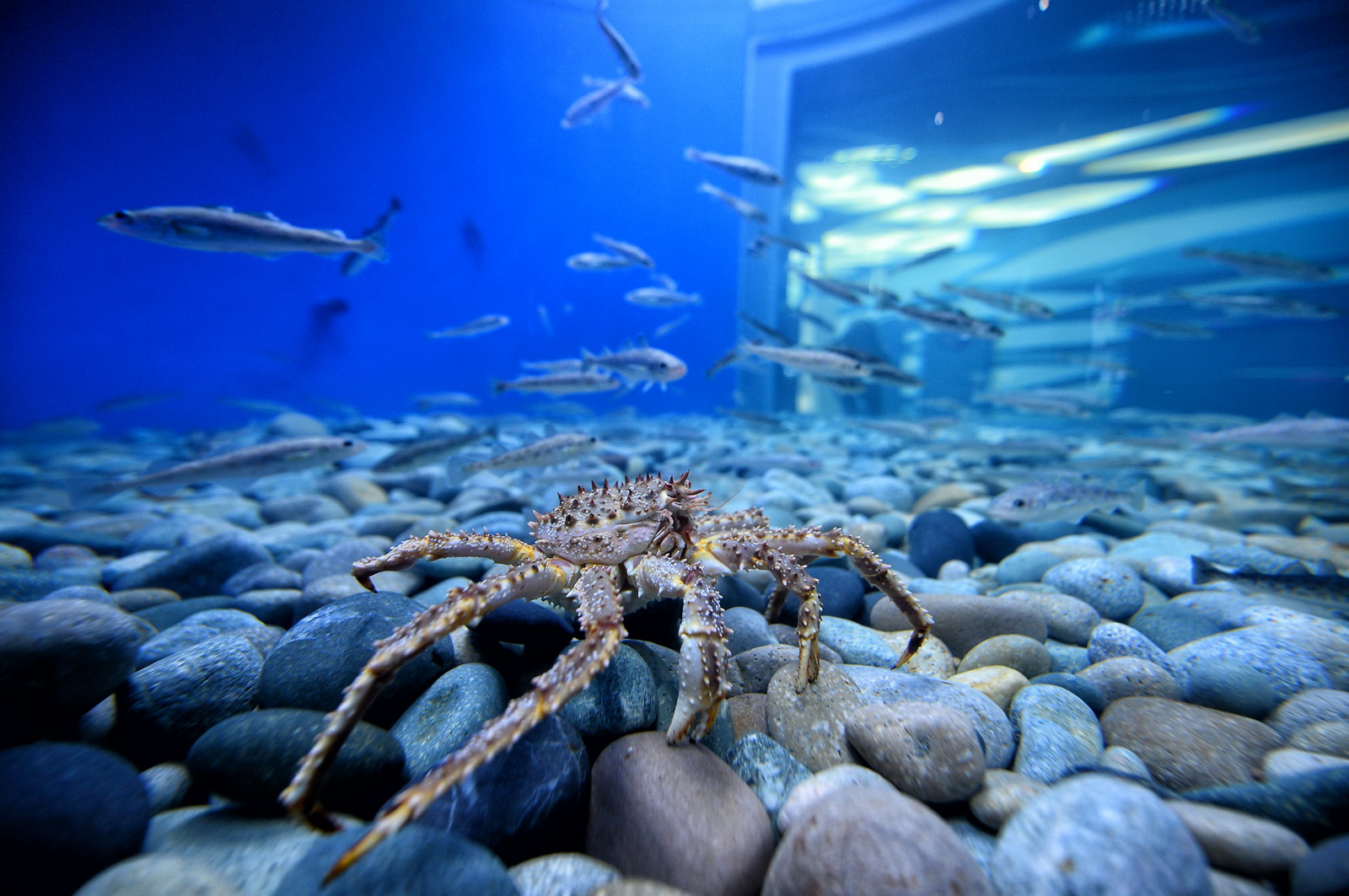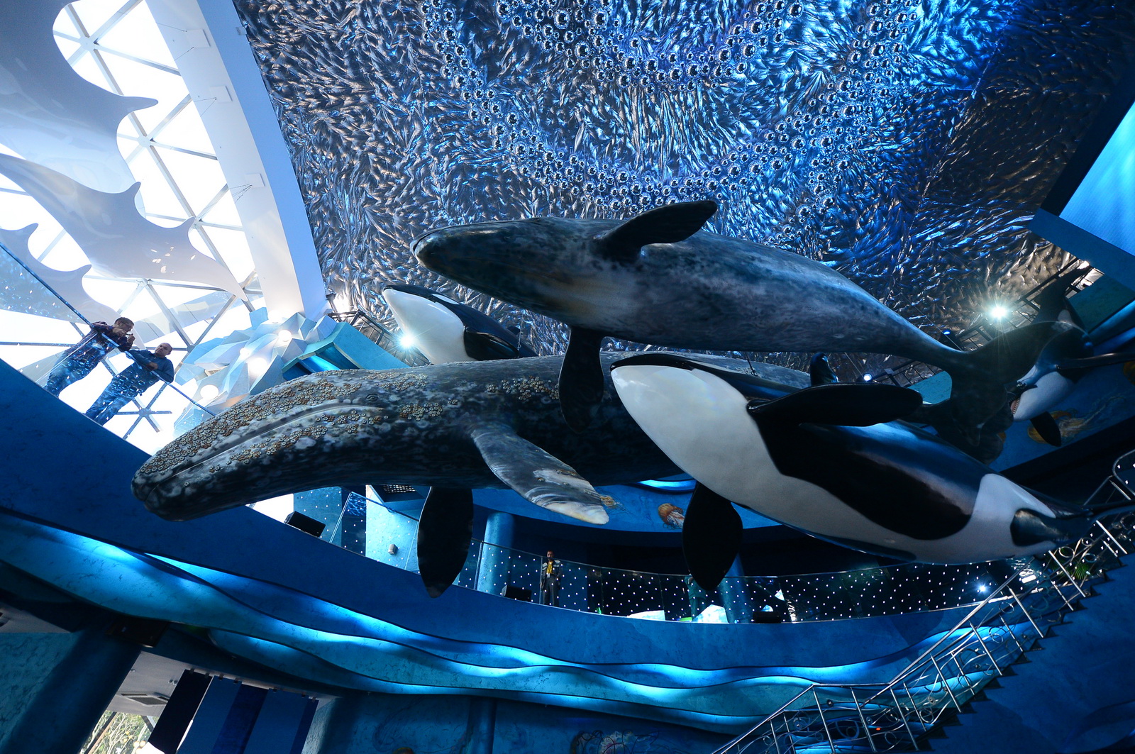 В холле демонстрационного корпуса под потолком висят горбатые киты и косатки едва ли не в полный размер. В "доисторической зоне" можно было потрогать больших движущихся динозавров. Впрочем, их через месяц дотрогали до того, что экспонаты сломались. Починив, работники океанариума без ограждения такие объекты уже не оставляли.