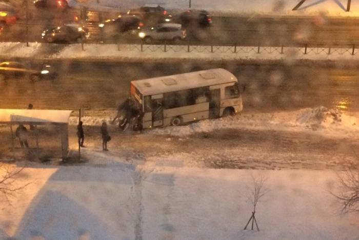 Утром у «Проспекта Большевиков» пассажиры выталкивали маршрутку из сугроба