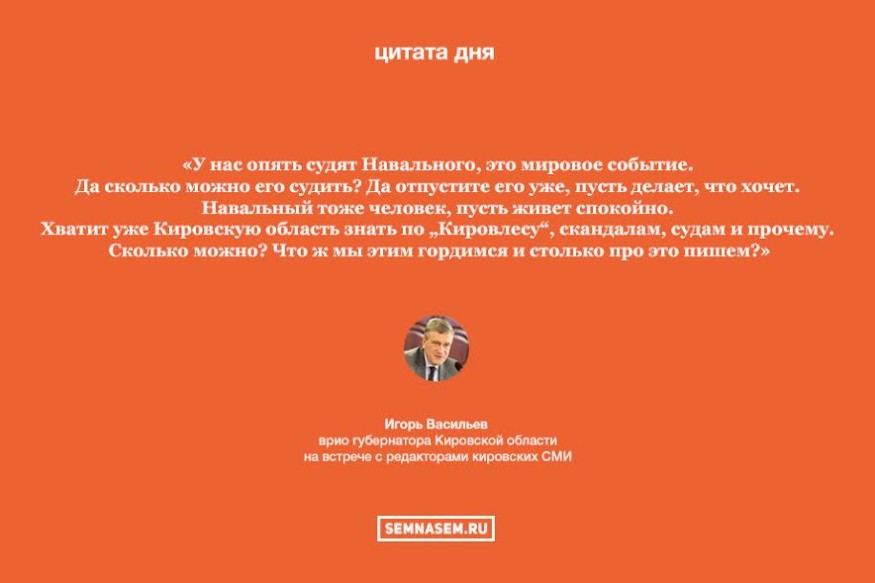На встрече с редакторами кировских СМИ 7 декабря Игорь Васильев, рассуждая о позитивной информационной повестке, высказался о процессе над оппозиционным политиком Алексеем Навальным.