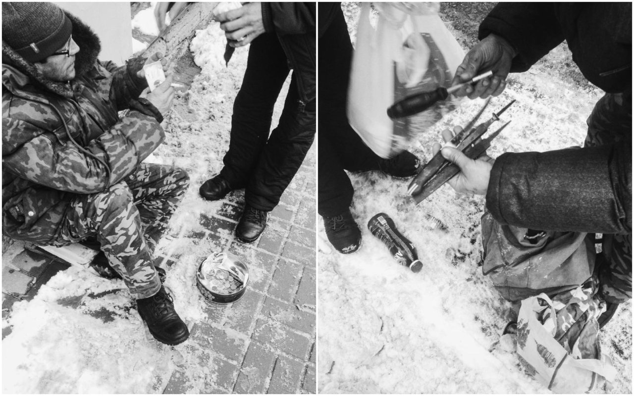 Мы с Кирюхой забираем несколько полных пакетов. Саня надевает военный бушлат, который нашел в помойке. «Пошел работать!» — шутит он. Бездомный садится около булочной и ставит перед собой баночку для денег. «Заметь, я не прошу милостыню. Руку ведь не тяну. Люди сами дают», — будто оправдывается Саня.