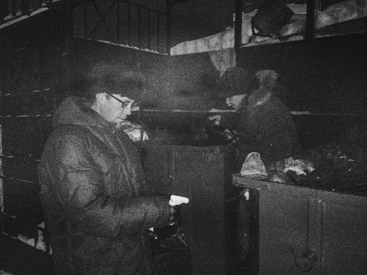 Согреваемся в лифтовой. Я пью чай, мужики — водку. Они считают заработанные деньги (вышло около тысячи рублей) и рассказывают о том, как познакомились, когда оба приходили в «Ночлежку» за помощью и как спали в собачьей конуре осенью.