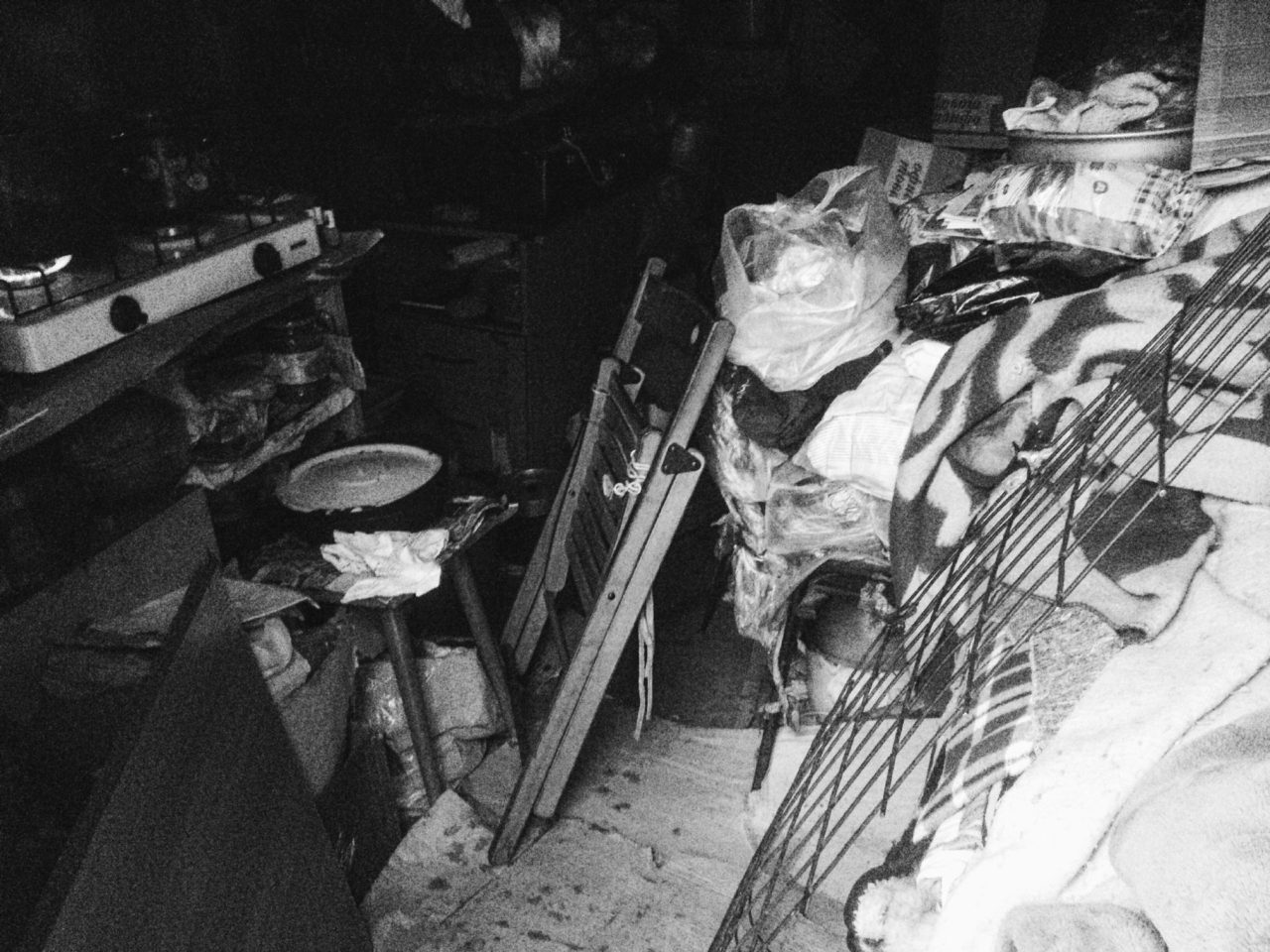 здесь тепло. Может, все не так плохо? Но как только я об этом думаю, звучит страшный лязг и грохот«Вот б***ь…» — думаю я, когда вижу крошечный — комнатой это сложно назвать — коридорчик три на полтора метра. В одном углу навалена куча одежды и каких-то пакетов. В другом — одеяла и подушки. На одной красуется грязный плюшевый мишка. Рядом горит лампочка, стоят кружки и банки. У окошка лежит пакет хлеба и восемь пачек творога. «Добро пожаловать в нашу лифтовую!» — шепотом декламирует Кирилл.