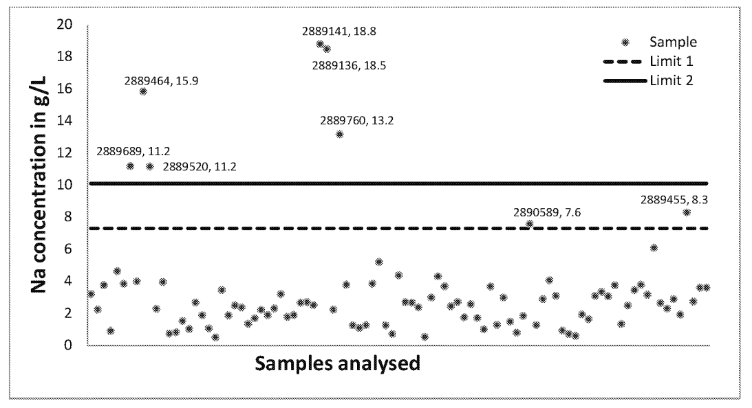 В заключении по результатам этого исследования говорится, что анализы под номерами 2890589 и 2889455 не превышают порог содержания соли для здорового человека в среднем по всей мировой популяции. При этом для среднего россиянина порог ниже (пунктирная линия), поэтому две эти пробы тоже признаны поддельными.