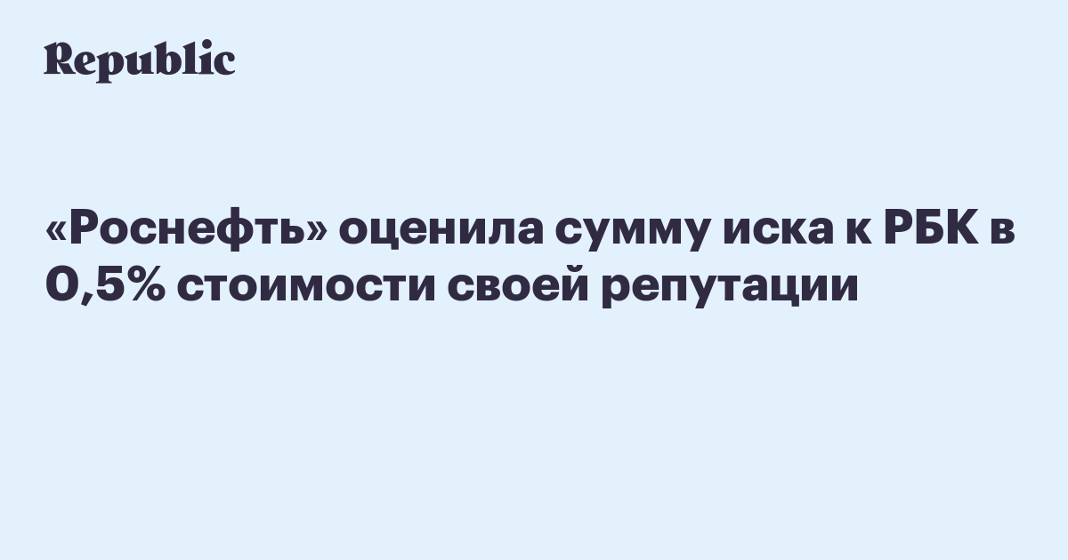 Исковые требования «Роснефти» к РБК в размере 3,2 млрд рублей – это 0,49% от стоимости деловой репутации компании. Об этом представитель «Роснефти» заявил на судебном заседании, передает РБК.