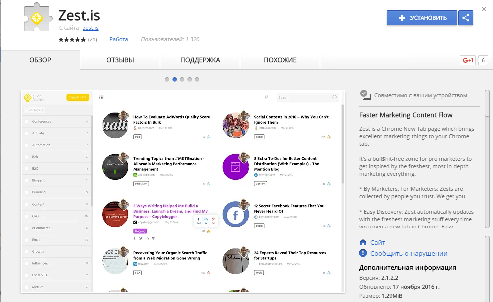 Приложение генерирует полезные статьи о маркетинге. Работает в виде расширенной вкладки для Google Chrome. Можно выбрать теги, которые наиболее актуальны для вас. Есть 29 различных тем. К примеру, инструменты, метрики, email, контент и другие. Также можно предлагать и свои статьи.