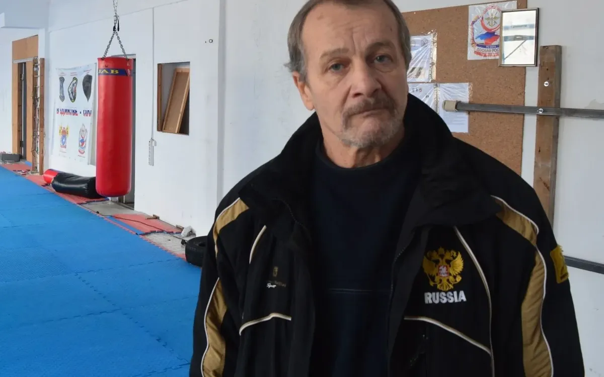 Петр Гилев, невысокий седой мужчина в куртке «Russia», чемпион мира и Европы по карате, стоит у кабинета №2.