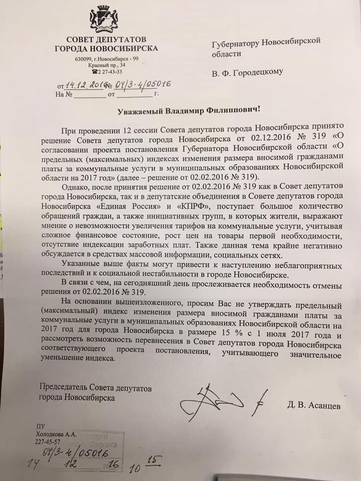 Копию письма опубликовала депутат Наталья Пинус. Напомним, федеральное правительство установило предельный индекс повышения тарифов ЖКХ для Новосибирской области в 4% с 1 июля 2017 года.