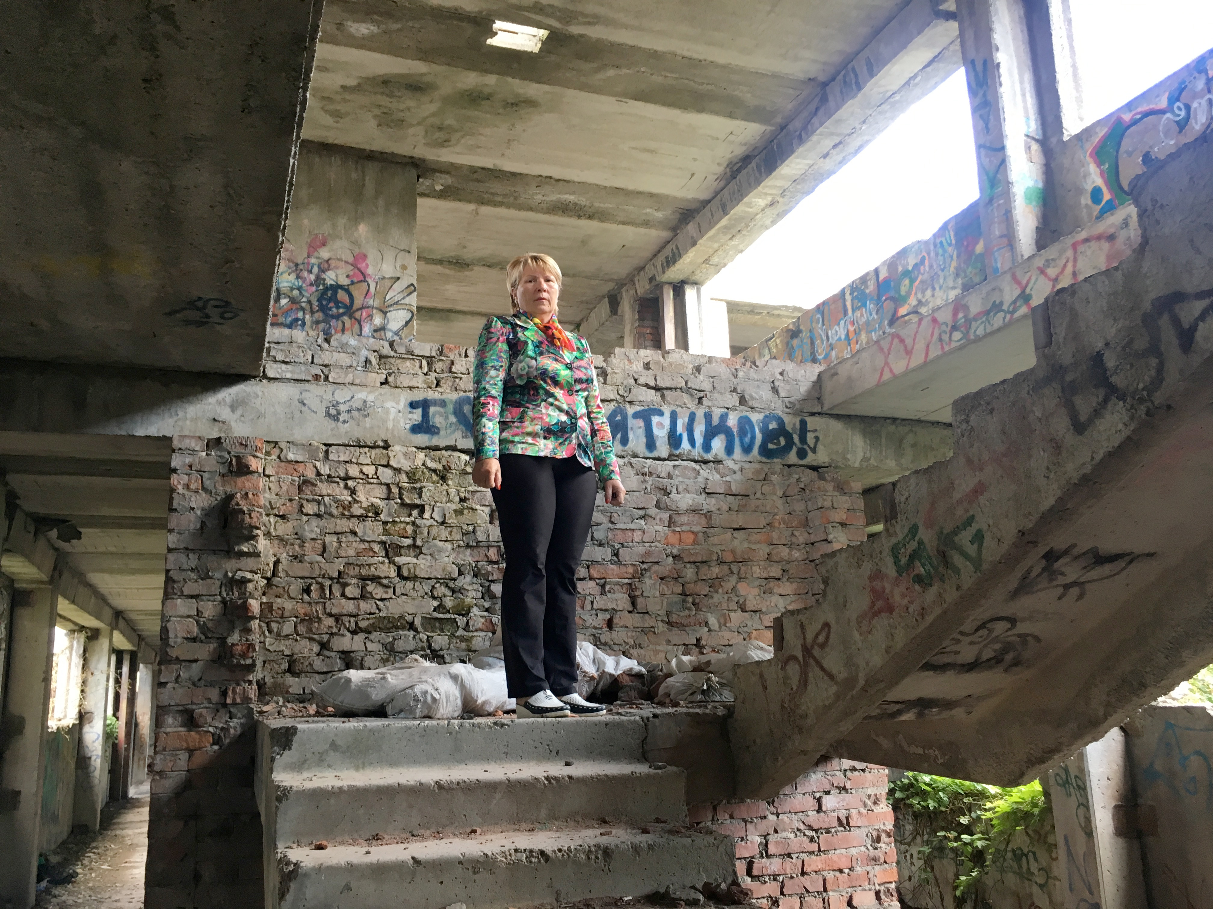 Пайщица Татьяна Белоус в здании недостроенного колхозного детского сада, станица Новотитаровская Динского района