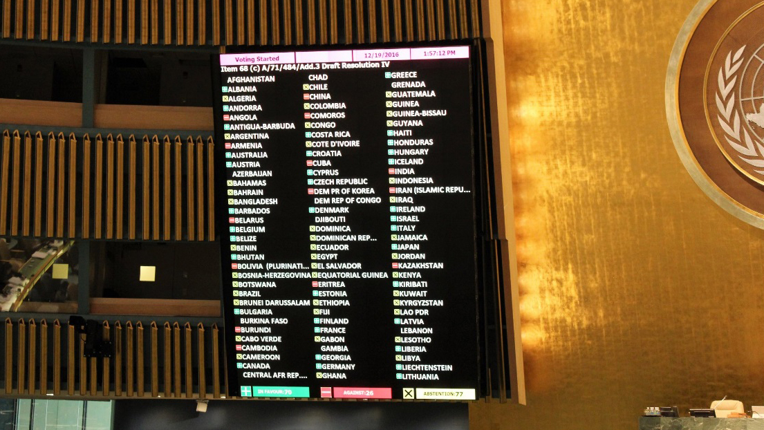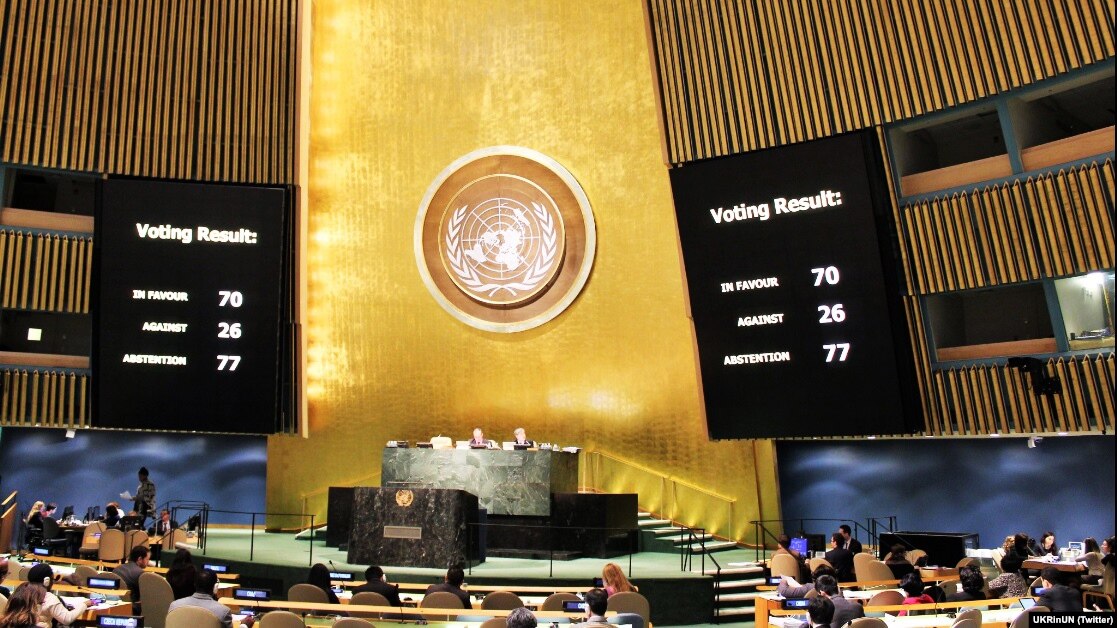 На заседании Генеральной ассамблеи ООН 19 декабря была принята резолюция о правах человека в аннексированном Россией Крыму. За украинский проект проголосовали 70 государств-членов ООН, против проголосовали 26, воздержались – 77 членов.