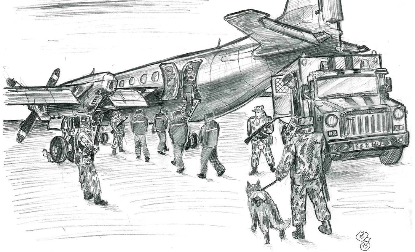 За бортом, по всей видимости, было действительно очень холодно — ветер гонял по взлетной полосе сухой снег, а техперсонал аэропорта ходил в толстых зимних комбинезонах. Конвой говорил, что на улице температура -15° или -20° С.