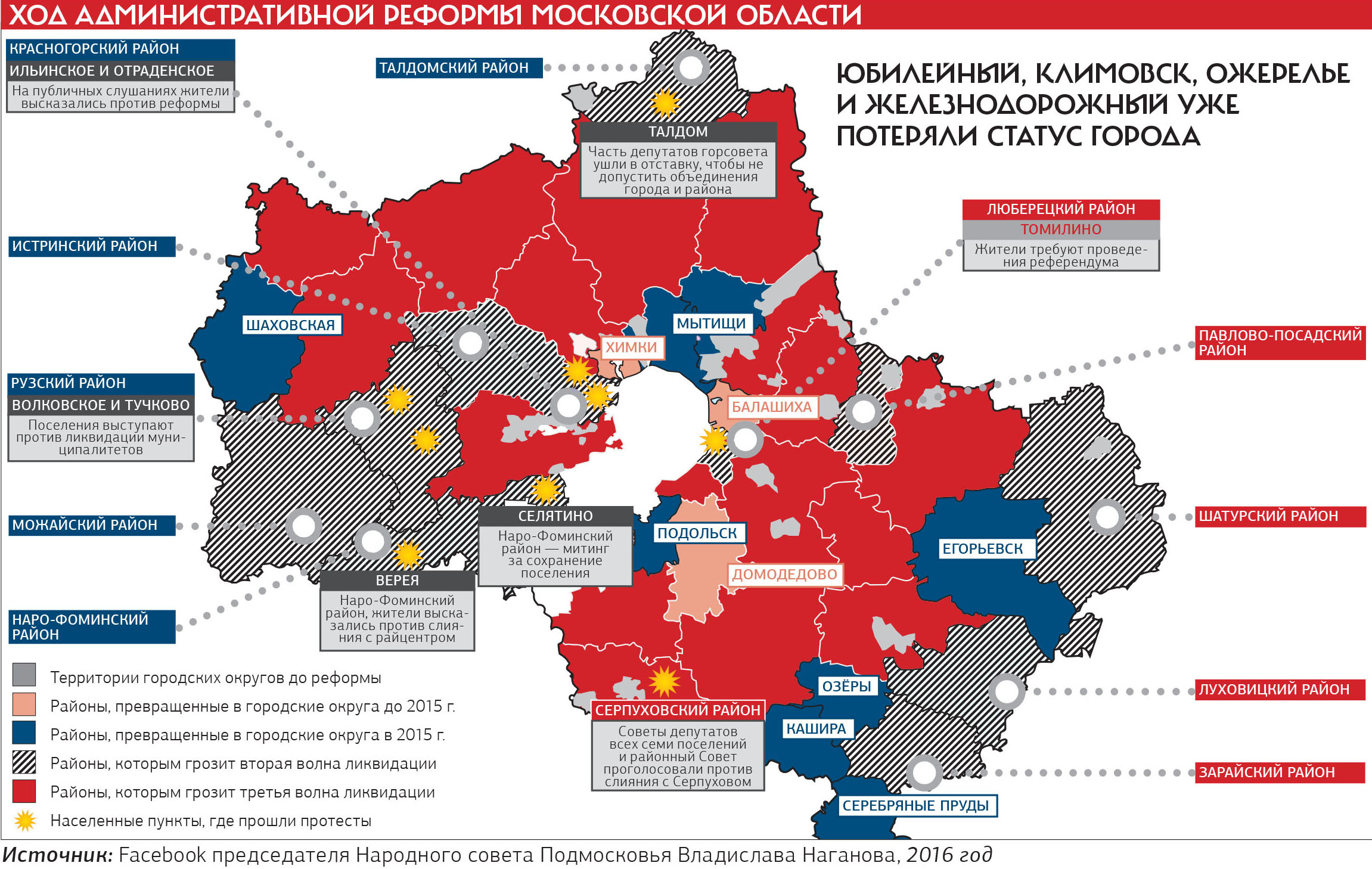 Официальные объяснения областной власти, конечно, другие: реформа продиктована заботой о населении. «Сокращение чиновничьего аппарата позволит сэкономить значительные средства бюджета, упростится принятие управленческих решений и ускорится реализация социальных программ, на территории муниципалитета будет действовать единая тарифная политика, единая инфраструктура», — пишет на своей странице в Facebook депутат Московской областной думы от «Единой России» Марина Шевченко.