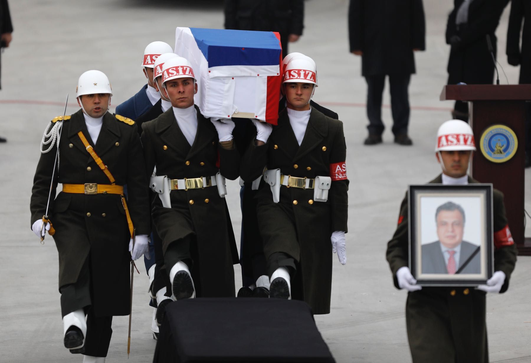 Гроб с телом убитого посла России в аэропорту Анкары. Фотография