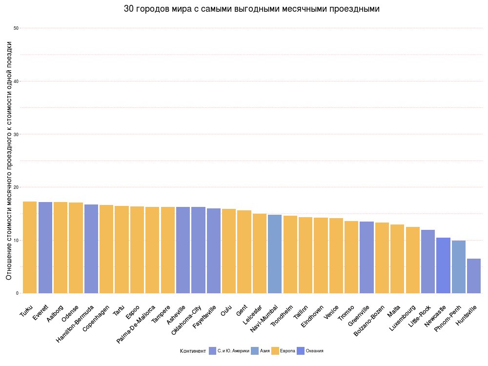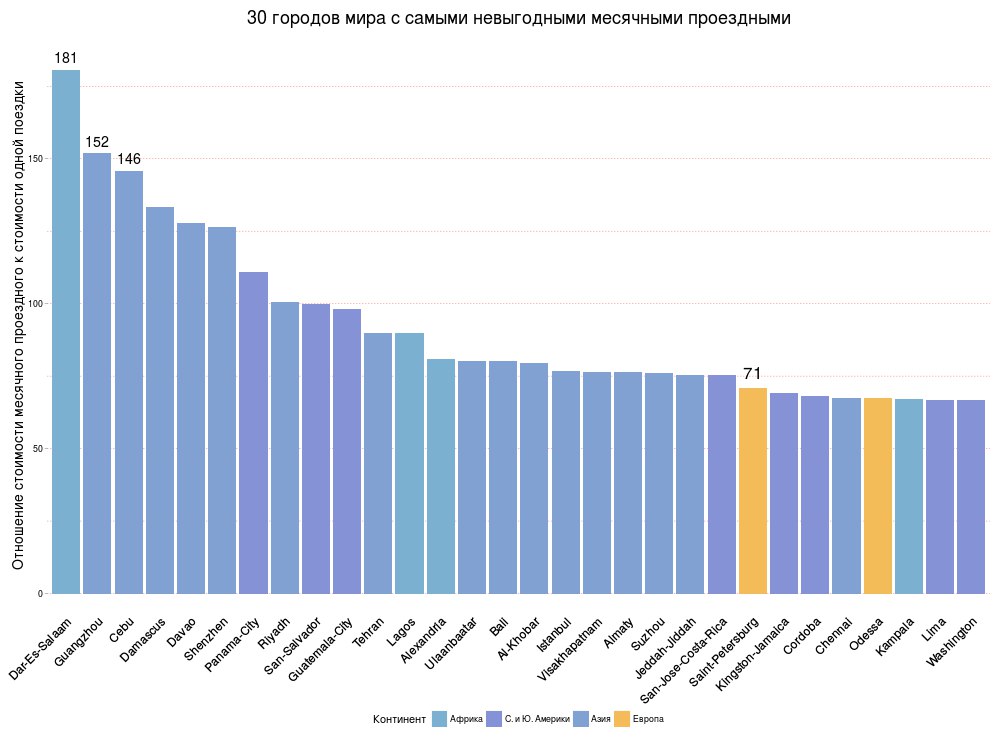 «Санкт-Петербург попал в топ—30 самых невыгодных городов мира, заняв 27 место со значением 71. Если использовать данные ГП (76,86), Петербург обгоняет Алматы и Вишакхапатнам, попадая на 19 место в мире . <…> Я решил обратить внимание на распределение по континентам (грубо, но показательно). Выяснилось, что Санкт-Петербург — худший город Европы для пассажиров общественного транспорта с Одессой на втором месте.