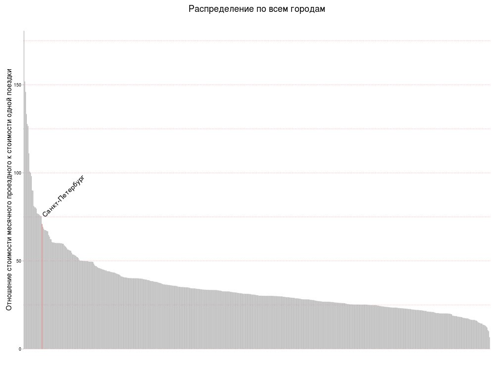 Само исследование посвящено эффективности тарифов на проезд в ОТ Санкт-Петербурга, и одной из ее мер берется отношение стоимости месячного проездного к стоимости одной поездки. Это разумно: так понятна выгода покупки безлимитного билета в сравнении с покупкой одноразовых поездок, и, как следствие, стимул для покупки месячных проездных и использования общественного транспорта