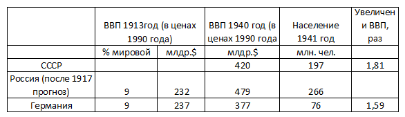 Напомню, что Россия в 1913 году имела 9% мирового ВВП, столько же имела Германия которая после поражения существенно утратила свои позиции. В период 1900 по 1913 в России естественный прирост населения составлял 1,5% в год, рост ВВП 3,4% в год, переведя эти цифры к 1941 году (с учетом потерь в первой мировой в 2 миллиона человек и с учетом того, что экономика в период войны с 1914 по 1917 не росла) Россия бы имела: