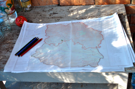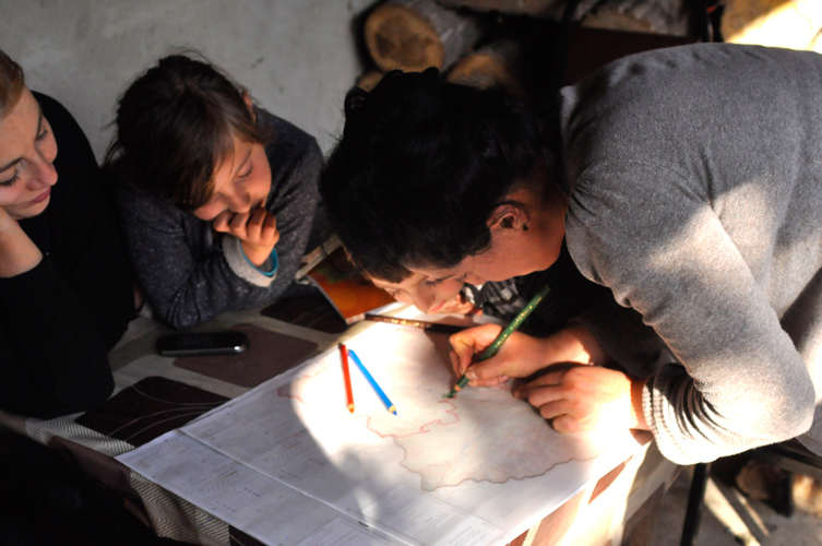 20 сентября 2016 года я приехала в село Земо-Никози, которое находится в непосредственной близости от границы с Цхинвальским регионом. Поселилась в семье бывшего председателя этого села с его многочисленными сестрами и племянниками. Его зовут Илия, ему 33 года. Я рассказала ему про свой проект: раздать жителям этого села карты, на которых они могут обозначить выжженные земли и утраченные сады. Илия стал моим проводником: мы ходили в гости к его соседям, и они охотно рассказывали о своей беде. Я предлагала им цветные карандаши и карты Горийского региона, на которые наклеила прозрачную кальку, где очертила красной линией зону оккупации. Соседи рисовали за этой жирной красной чертой то, что считали потерянным.