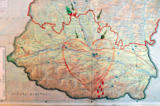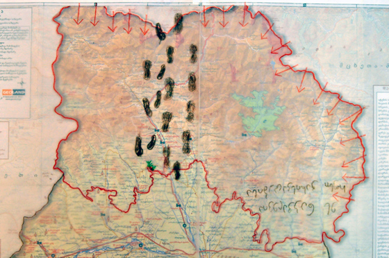 © Наталья Никуленкова Серхио, 21 год: Вот Цхинвали, русские солдаты оккупировали наши земли. Я нарисую на этой карте следы от сапог русских солдат. Здесь раньше была зеленая территория, теперь она черная после огня.