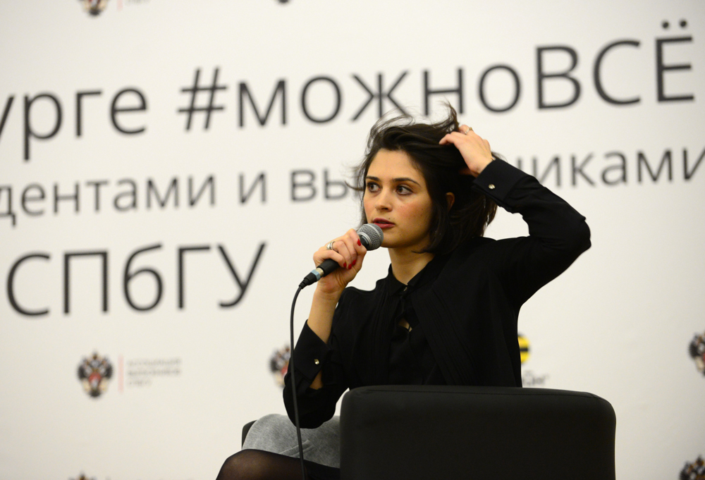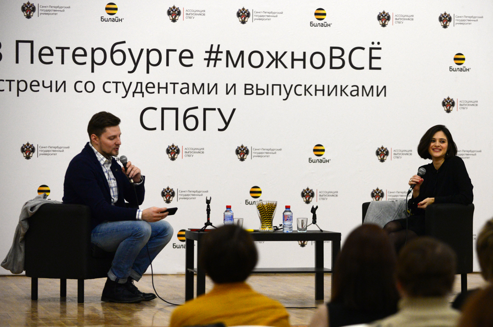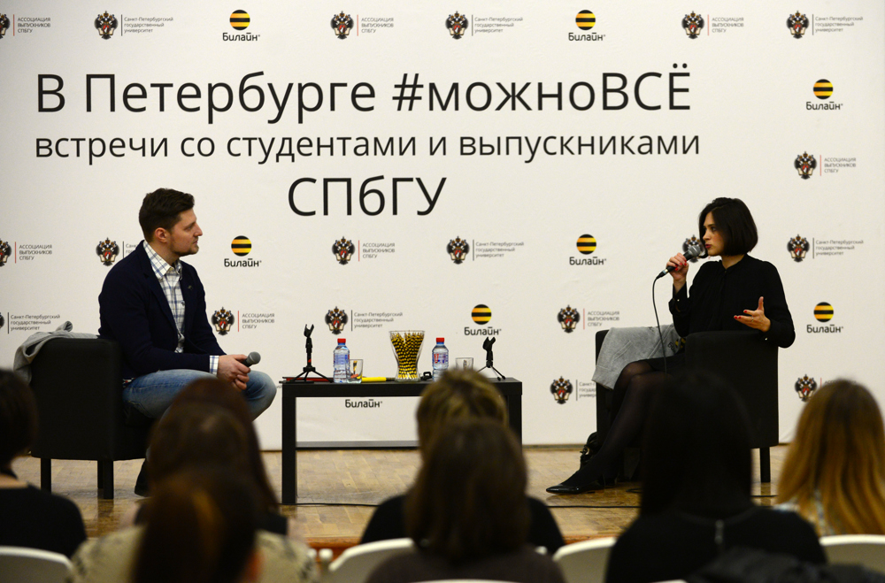 АМ: Женя, за участие во встрече мы дарим тебе эту кофту. Важный момент: на ней написано «СПбГУ».