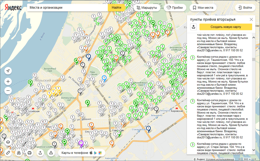 Самарская активистка Светлана Аверина создала Карту пунктов приема вторсырья на сервисе Яндекс.Карты. Активистка самостоятельно проверила информацию о пунктах, связалась с владельцами контейнеров и подготовила подробные комментарии по каждому контейнеру и пункту приема. Подробнее про проект.