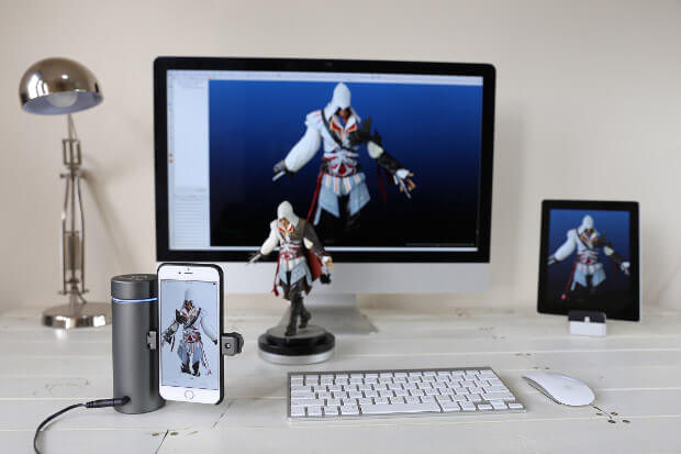 Eora 3D нужно всего лишь подключить к обычному смартфону. Приложение управляется с помощью зеленого лазера в цилиндрическом корпусе через Bluetooth. Во время сканирования iPhone одновременно управляет вращением сканера на подставке и фотографирует объект сканирования, после чего данные сопоставляются, и на выходе пользователь получает цветную 3D-модель объекта. Сканер стоит $319.