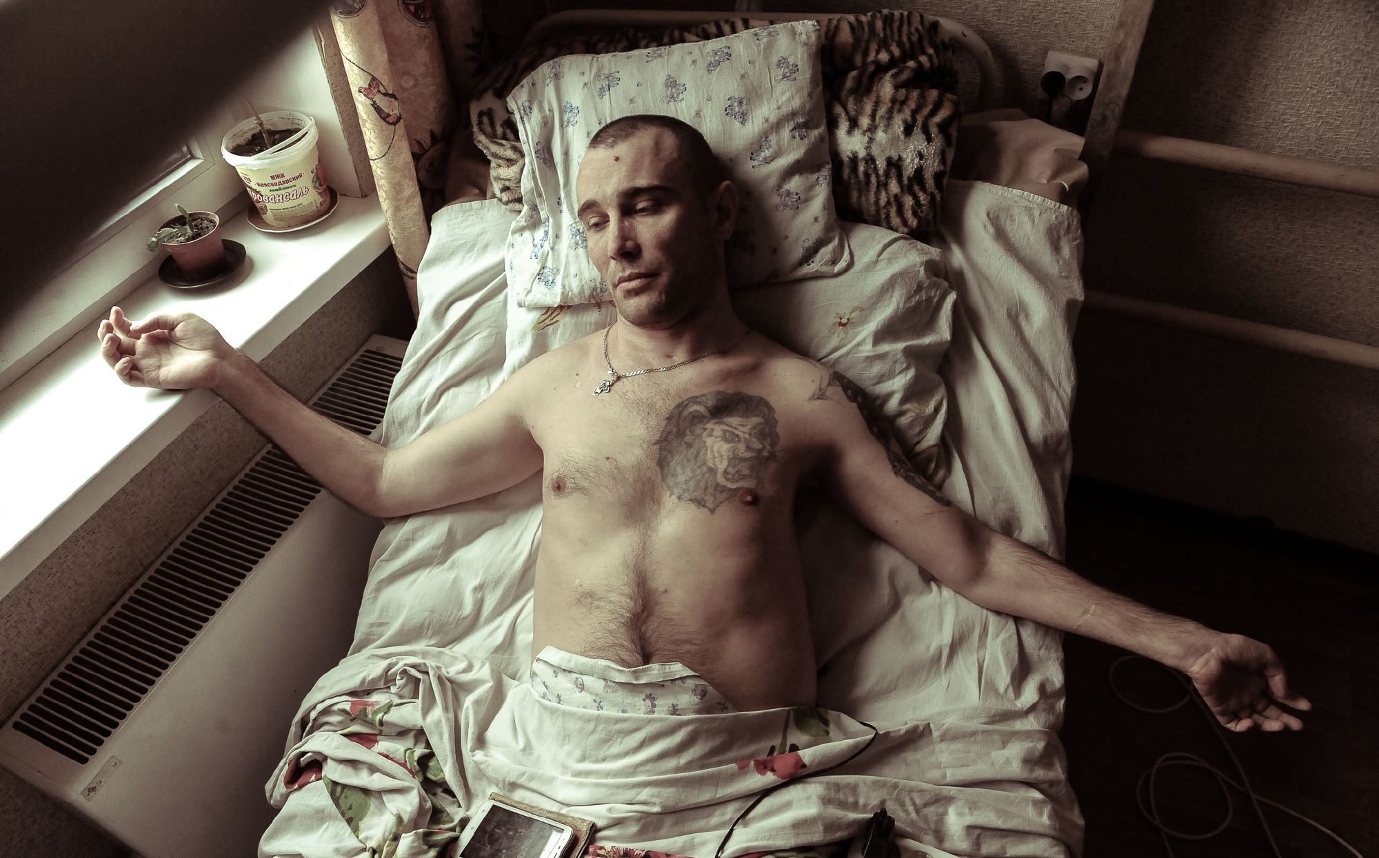 Все молодое и прекрасное тело Володи иссечено, оно в заплатках из кусочков его собственной кожи, шрамы от пролежней повсюду, вырезан огромный кусок из попы, одна нога почти в два раза тоньше другой, столько мертвой гноящейся ткани пришлось удалить. Движения в ногах нет никакого — даже пошевелить ступней Володя не может.