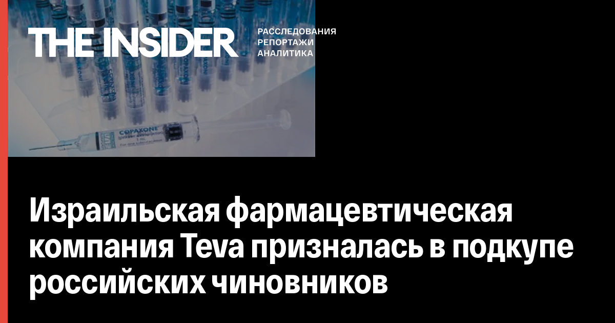 Израильская фармацевтическая компания Teva и ее российская «дочка» признались, что давали взятки российским чиновникам, для того чтобы повлиять на закупки для Минздрава. Как сообщается на сайте Минюста США, таким образом в 2010–2012 годах компания договорилась о поставках в Россию препарата копаксон, который используется для лечения рассеянного склероза.