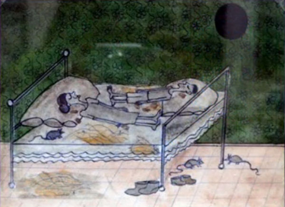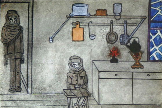 Рисунок Вали Тонск Валя всю блокаду вела концептуальный дневник-комикс (лучше сказать, дневник-макабр), мелкими нумерованными рисованными прямоугольничками с подписями, по несколько на альбомном листе. Она подписывала сюжеты своих картинок, чтобы никто не сомневался в достоверности ее труда. Последовательный отчет о событиях военных дней умирающего города сделан жесткой детской рукой не наперекор морозу и голоду, а словно с ними заодно. Она по-детски настойчиво документировала блокадные кошмары (машины с наваленными трупами, замерзшие прохожие, куски человечины в комнате людоедки, прочие атрибуты войны), которые видела дома и из высоких окон своей коммунальной квартиры, интерьеры и вещи которой рисовала точно так же, как и макабрические блокадные сюжеты: с умилительным детским чувством уюта, что делает ее маленькие картинки пронзительными, как монументальный припадок общего тела. Изображала ли она только то, чему достоверно была свидетелем, или же и те сюжеты, о которых говорили вокруг взрослые, сказать теперь невозможно. Но в контексте мифа о блокаде, дошедшего до нас, ее рисование выглядит абсолютным документом, не требующим специального подтверждения.