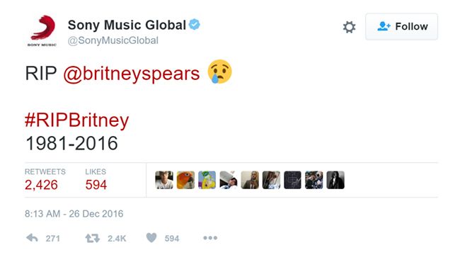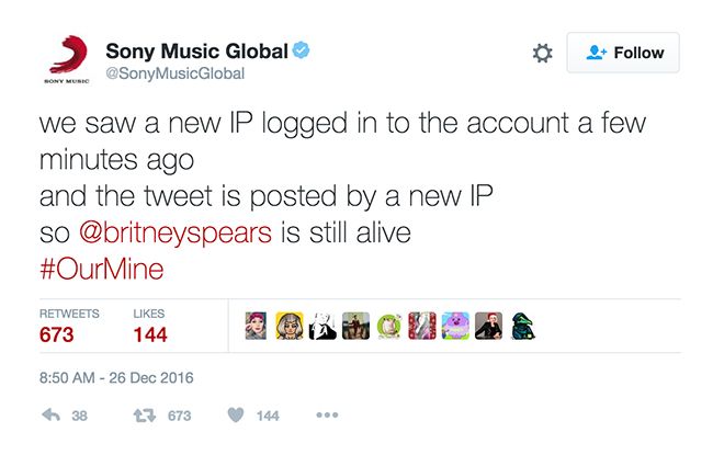 Хакеры из группы OurMine 26 декабря взломали твиттер-аккаунты компании Sony Music Global и музыканта Боба Дилана, оставив в них сообщения о смерти певицы Бритни Спирс.