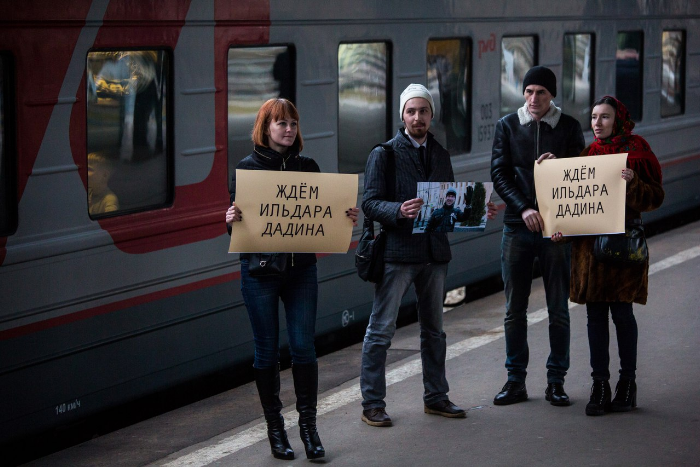 Активисты прошлись с плакатами вдоль двух поездов на вокзале, изображая встречающих. После этого они попросили сотрудницу вокзала объявить по громкой связи, что хотели встретить пассажира Ильдара Дадина, но он потерялся.