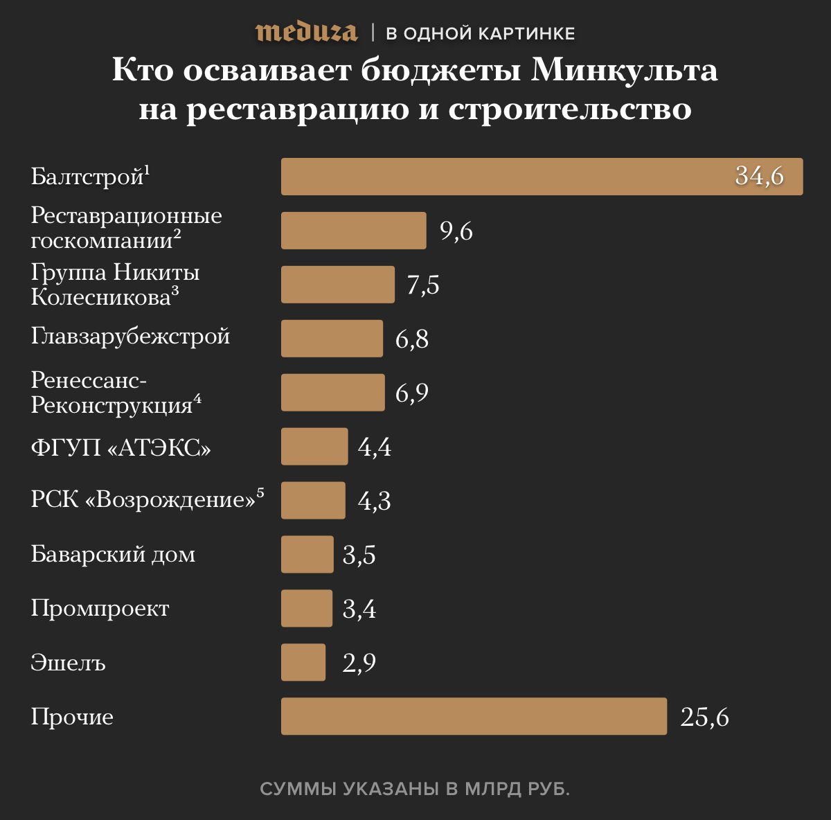 «Медуза» проанализировала тендеры на проведение реставрационных и строительных работ, объявленные структурами Минкульта в 2012–2016 годах, на общую сумму 109,4 миллиарда рублей — и выяснила, что почти 40% контрактов заключили структуры, аффилированные с «Балтстроем» и бизнесменом Никитой Колесниковым. Эти компании начали проявлять активный интерес к тендерам Минкульта с лета 2012-го, вскоре после появления в ведомстве девелопера Григория Пирумова, соседа Мединского по дому напротив Третьяковской галереи.