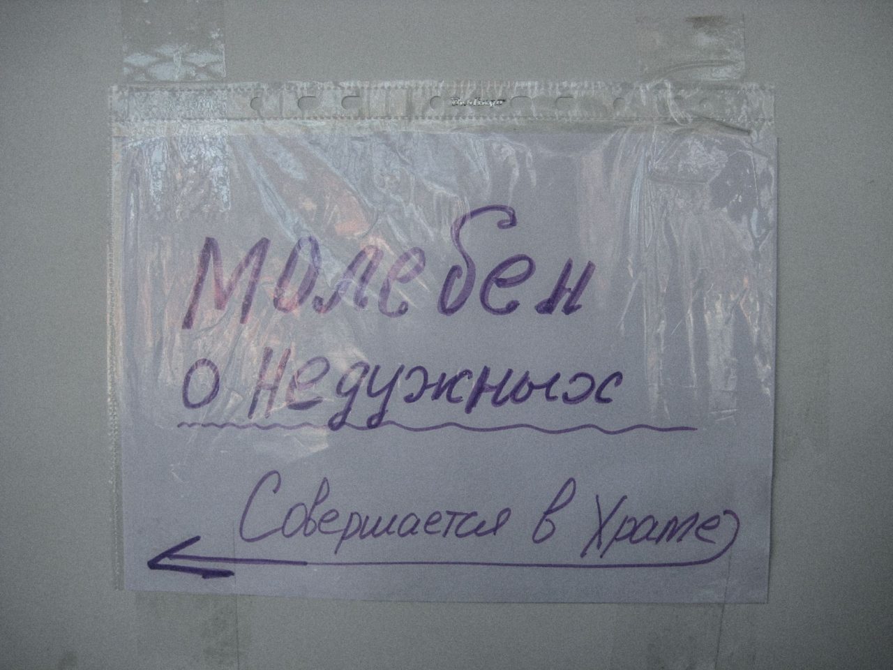 Проповедь длится сорок минут, затем начинается молебен. Батюшка читает заклинательные молитвы. Ему помогает отец Михаил. Одна из женщин тут же аккуратно падает на пол и начинает биться в конвульсиях, не забывая при этом поправлять платок, который постоянно съезжает с головы. Со всех сторон раздаются вскрики и стоны. Они усиливаются вместе с голосом отца Владимира. Батюшка обращается к нечистому духу, который находится внутри женщины: «Заткни свой бесовской рот!» — звонко шлепает книгой по головам и животам — в зависимости от того, где сидит бес. Люди реагируют не сразу. Считается, что если бесы молчат, значит, им «комфортно» — они сидят глубоко.