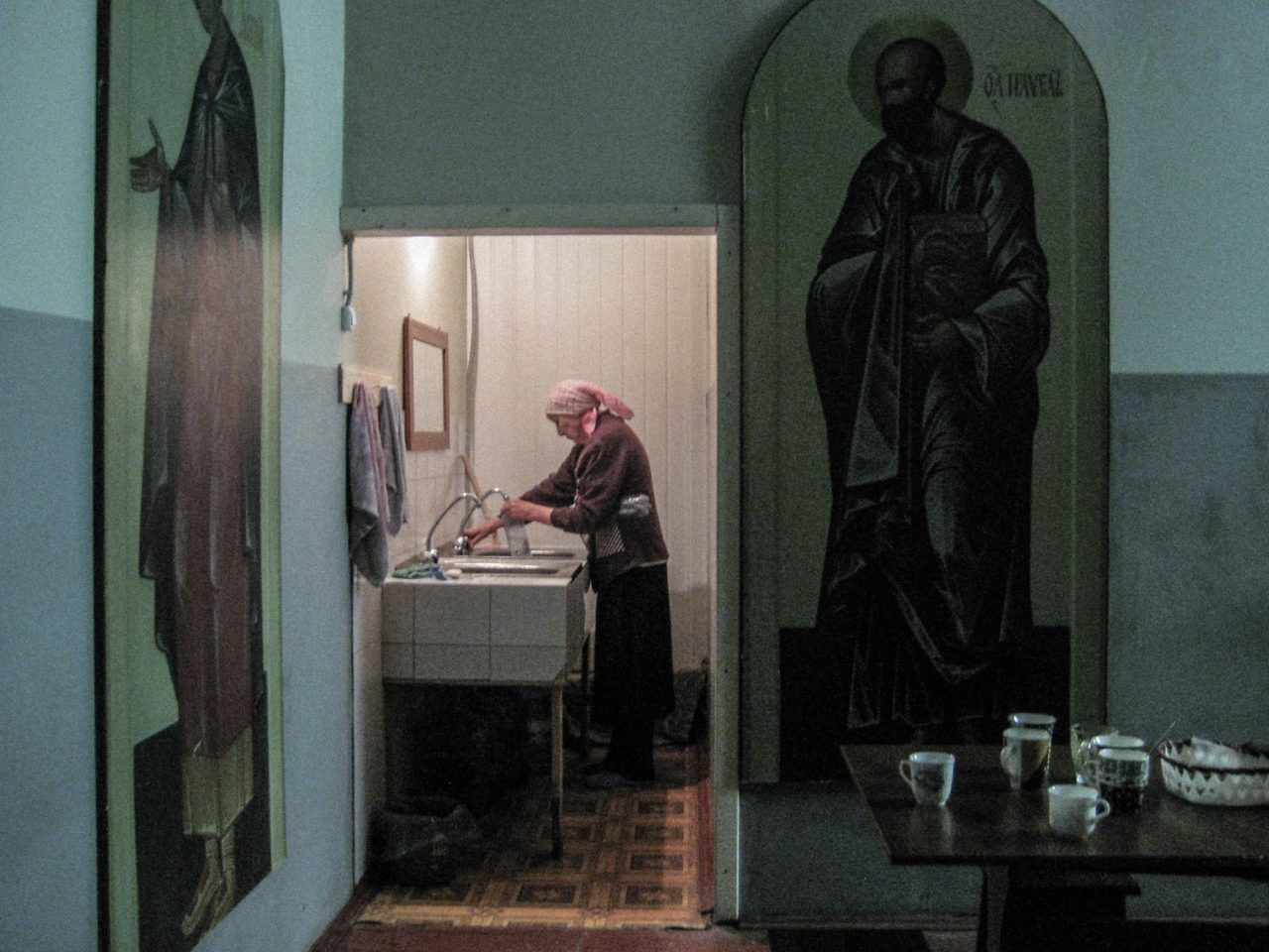 Ночью захожу на кухню. «Это война, вы встаете на тяжелый путь. После молебна бес захочет забрать вашу благодать — могут даже обокрасть», — говорит мне координатор поездки Светлана и запивает водой феназепам.