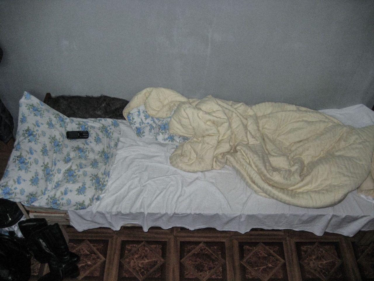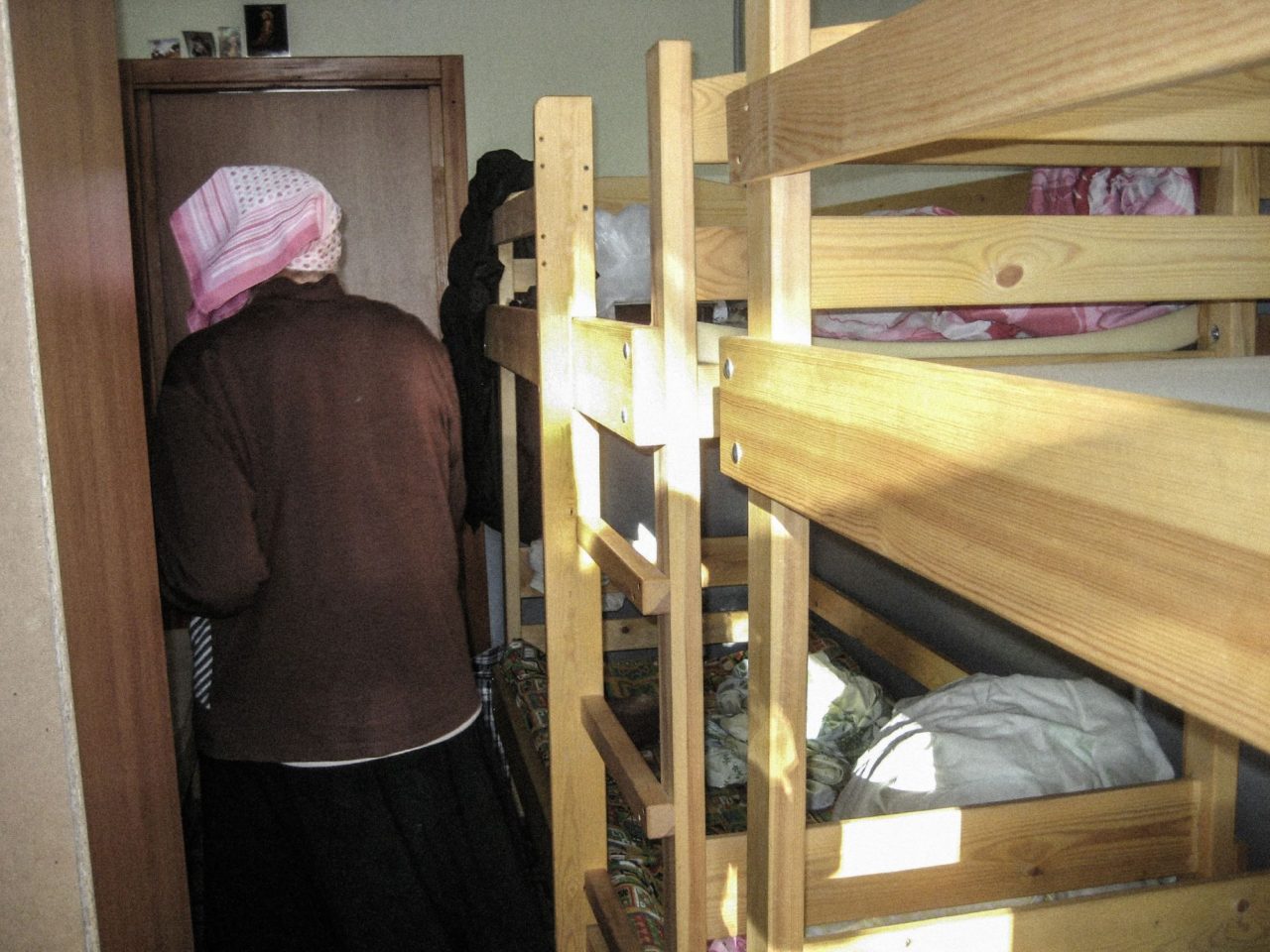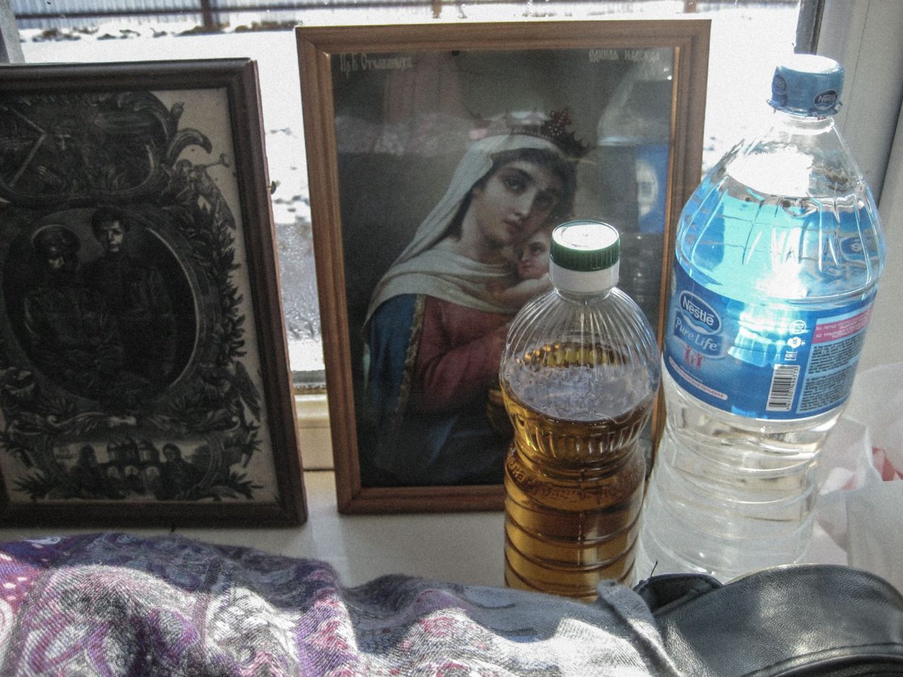 В спальне четыре двухъярусные кровати, две обычные. На двери иконка, на окне — фотография царя Николая, икона Божьей матери и бутылка подсолнечного масла. Все свободное время паломники молятся.