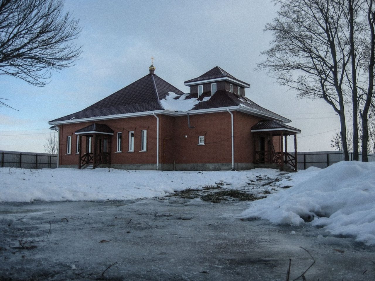 Храм из рыжего кирпича. Черепичная крыша и внушительная железная дверь делают его похожим на крепкий загородный дом. Внутри храма еще идут строительные работы. Купол закрыт полиэтиленом, три стены бетонные, алтарная — бледно-персиковая — заставлена иконами. Алтарник рассказывает, что лики святых распечатали на холсте, это был самый дешевый вариант.