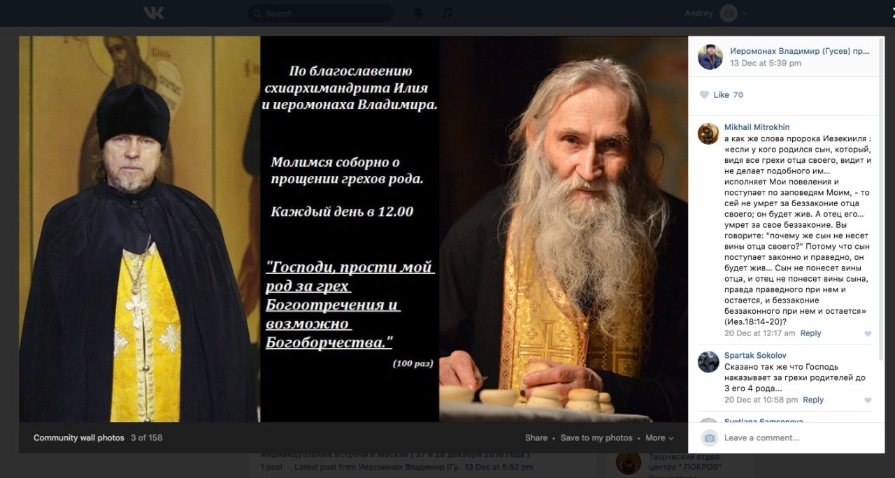 Как жить, если в тебе сидит бес? «ВКонтакте» предлагает ответ на этот вопрос. Страница иеромонаха Владимира (Гусева) создана с его благословения. Отец Владимир — священник РПЦ, профессор богословского отделения Международной Славянской академии, экзорцист. При каждой возможности помощницы Гусева стараются упомянуть: батюшка изгоняет бесов по благословению схиархимандрита Илия (Ноздрина), духовника патриарха Московского и всея Руси Кирилла.