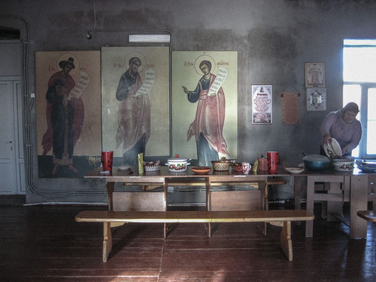 В гостевом доме пахнет краской. До головной боли. Строятся новые комнаты — спрос на отчитки растет. Стены пока еще бетонные, но уже с изображениями святых во весь рост. В трапезной длинный стол, на шкафу — гитара.