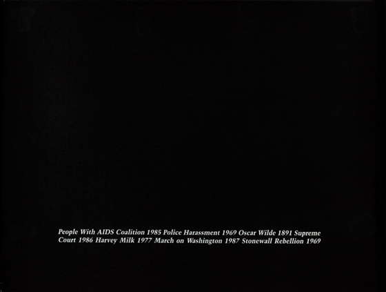 Феликс Гонзалес-Торрес. Без названия. 1989 Но все это было бы слишком иллюстративно. Как самостоятельный художник, Гонзалес-Торрес изобрел личный вариант таймлайна. Хотя смерть любимого прямо относится к бездействию правительства в отношении эпидемии, этот внешний контекст не способен выразить единственность этой смерти. Отмеченное на «активистском» таймлайне, это событие, даже будучи выделенным, остается статистикой. Так что таймлайны Торреса — это череда записанных фактов, не отделенных друг от друга никакой пунктуацией, не имеющих хронологической последовательности чтения, следовательно, не подразумевающих никакого прогресса. События публичной и личной жизни, политики и поп-культуры перемешаны без объяснений. Встреча выпускников 1987 Уотергейт 1972 Росс 1984 Оскар Уайльд 1895. Таймлайны Торреса доделывают работу пессимистического просвещения, которую выполняет медиатеория: они решают проблему соотношения внутренних и внешних событий, не сводя отдельное человеческое существование к могущественной и десубъективирующей логике биополитики и войны. Для Торреса война не локализовалась в милитаристской машине, как в случае сюрреалистов, и не нависла над повседневностью в виде угрозы армейского призыва, как у «мухоморов»; она идет далеко, но одновременно распылена повсюду. Дистанция замедленного осмысления в работах Торреса аналогична дистанции меланхолического взгляда, направленного из Америки на войну, ведущуюся где-то за океаном.